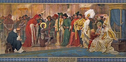 このとき、シャルル7世は家臣を玉座に座らせて自らは臣下の列に紛れ込んでいました。ジャンヌが聖人であるならば自分のことを見抜くことができるはずだと思ったのです。ジャンヌが迷わず王太子の元へ向かったのでシャルル7世は本物であると認められました。(ただし、一説には臣下がさりげなく誘導したともいわれていますが…)